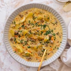 This cheeseburger soup is loaded with carrots, potatoes and ground beef, lots of melty cheese and tastes just like the name suggests – a delish burger!
