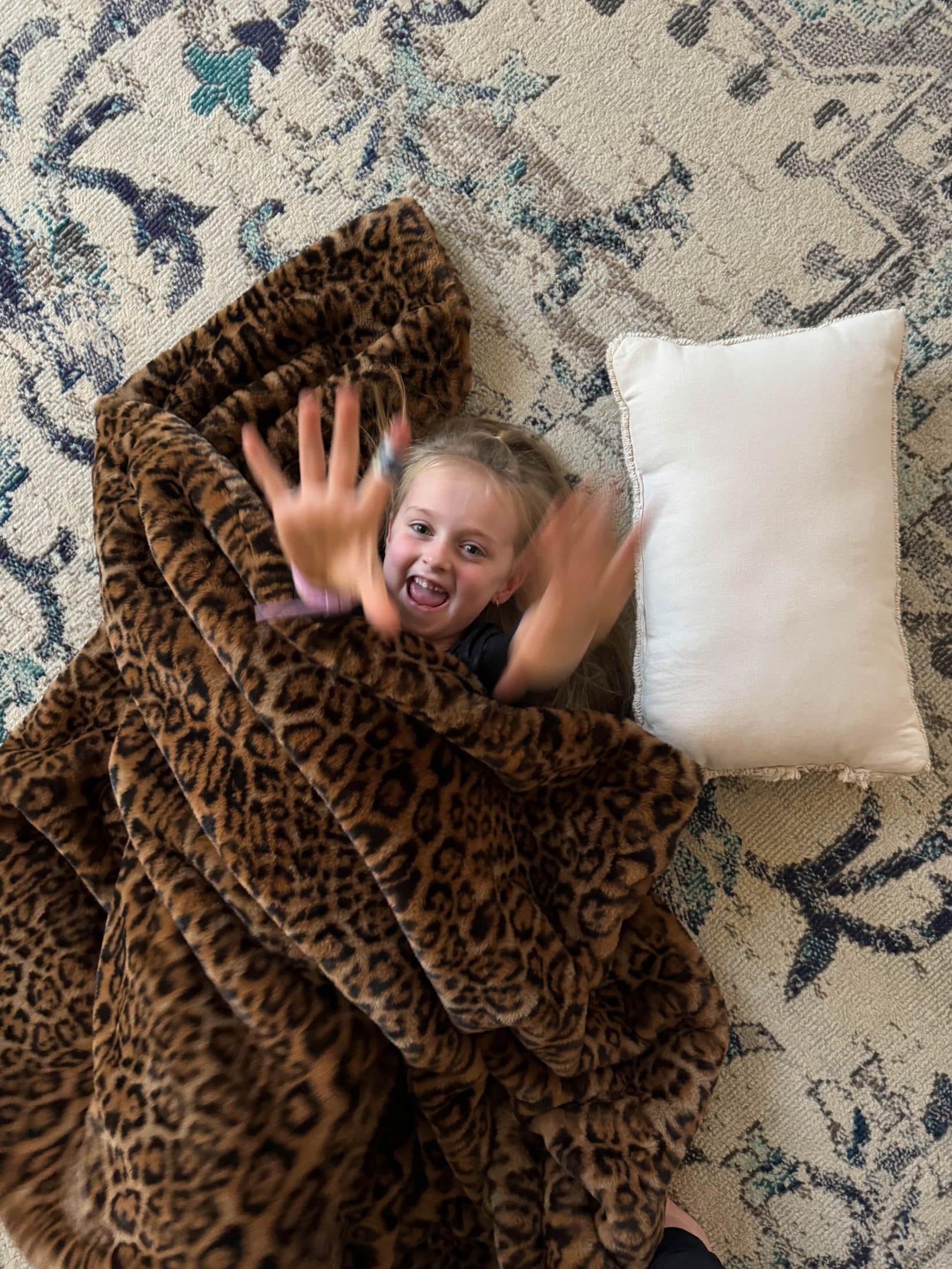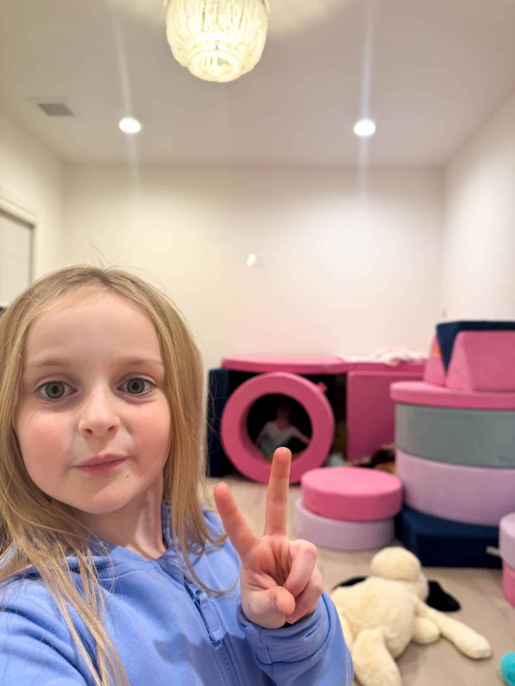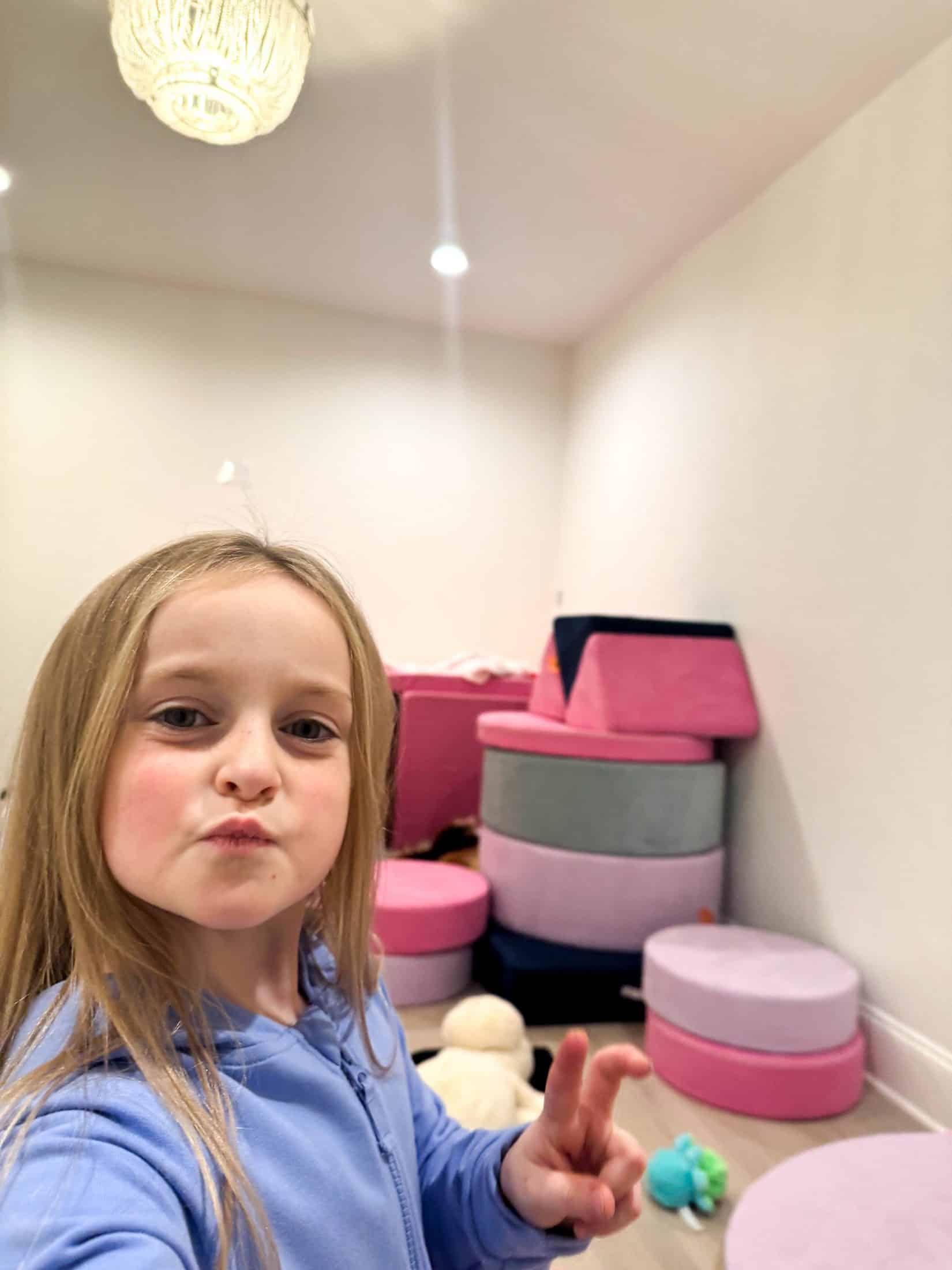 I am dying. Emilia took a picture of what she built with the nugget couches. This is how she returned my phone – with this pose!!