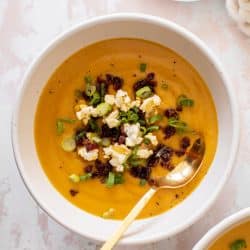 This honeynut squash soup is creamy and silky, starting with chipotle candied bacon and ending with buttered popcorn. It’s super smooth and satisfying and all the crunchy toppings just make it fabulous.