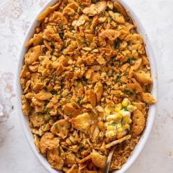 This scalloped corn is the perfect holiday side dish! Creamy, creamy and crunchy, it’s baked until warm and bubbly and cheesy, then topped with buttery ritz crackers. Tons of flavor and so easy to make!