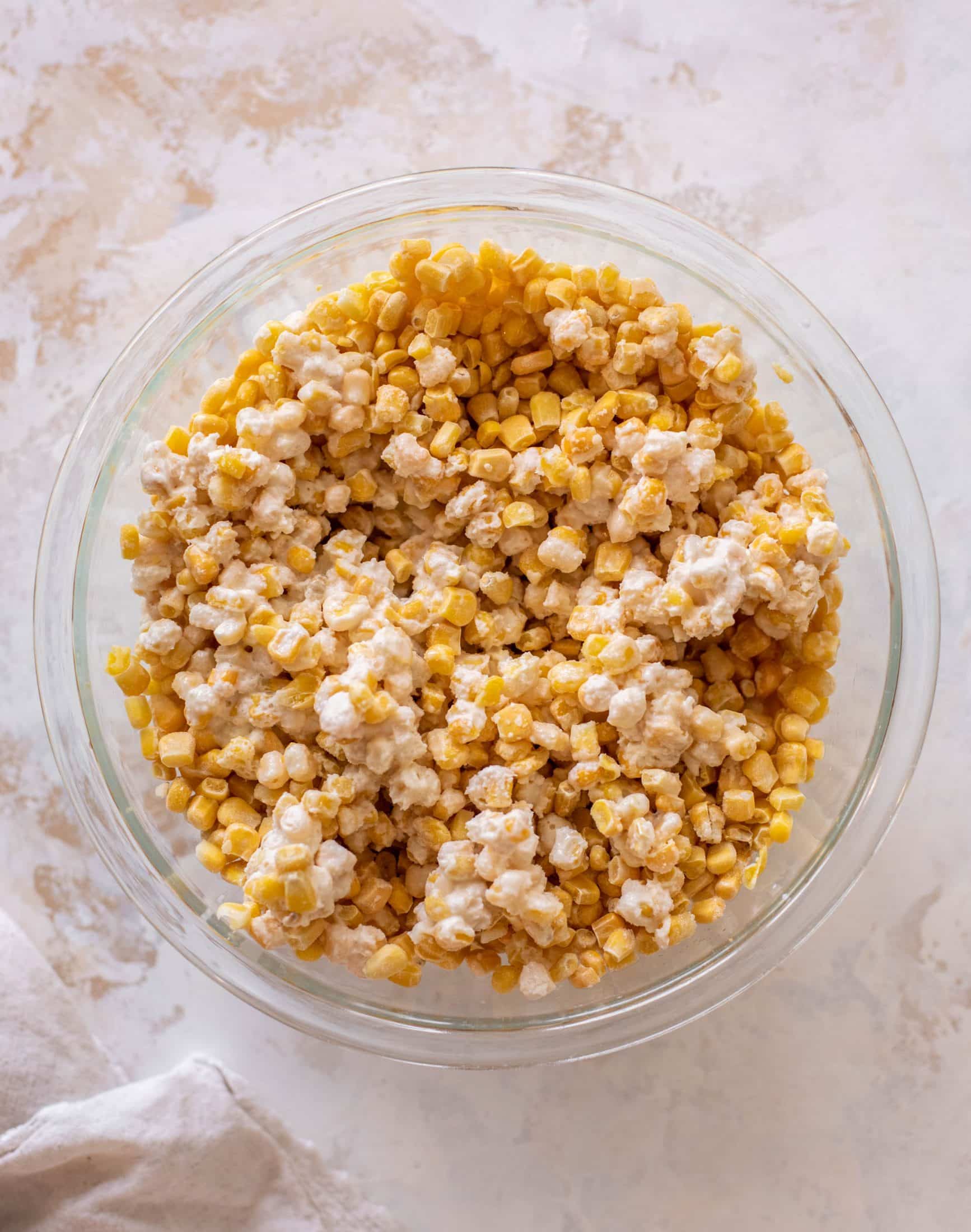 - While the corn bakes, stir together the remaining crushed crackers and the melted butter until the crackers are moistened.