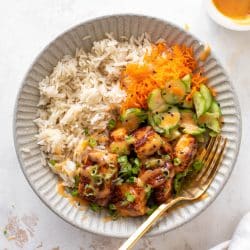 This bang bang salmon is so tender and juicy, served over jasmine rice with carrot and cucumbers and a creamy, spicy sauce. It’s incredibly satisfying and tastes amazing!