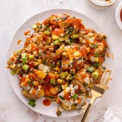Oh, oh and I should remind you that you actually CAN add chicken to this if you don’t want just buffalo. You could throw some shredded rotisserie chicken on top if the potatoes when melting the cheese.
