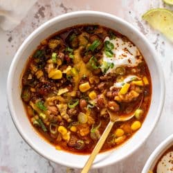I love how incredibly satisfying this bowl is. It’s hearty like chili but still has enough broth to feel light. The beans and ground beef/turkey (I use both, whatever I have on hand!) up the satiety and the corn adds some crunchy sweetness. There is just so much flavor, texture and all around goodness.