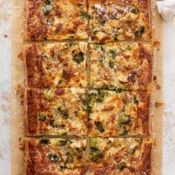 This grilled chicken broccoli pizza is on flaky, buttery puff pastry, drizzled with garlicky olive oil and sprinkled with tons of cheese.