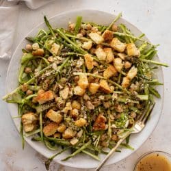 I love a good asparagus salad! This one is filled with shaved asparagus, chickpeas, sliced almonds and feta cheese. Topped with light and crunchy brioche croutons, the texture is amazing! Finish it off with honey mustard vinaigrette for the best flavor ever.