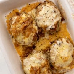 This french onion meatloaf is absolutely divine. Tender mini meatloaves blanketed with melted gruyere cheese and topped with piles of caramelized onions. They are best served over mashed potatoes, but let’s be real: you’ll be tempted to eat them straight out of the baking dish.
