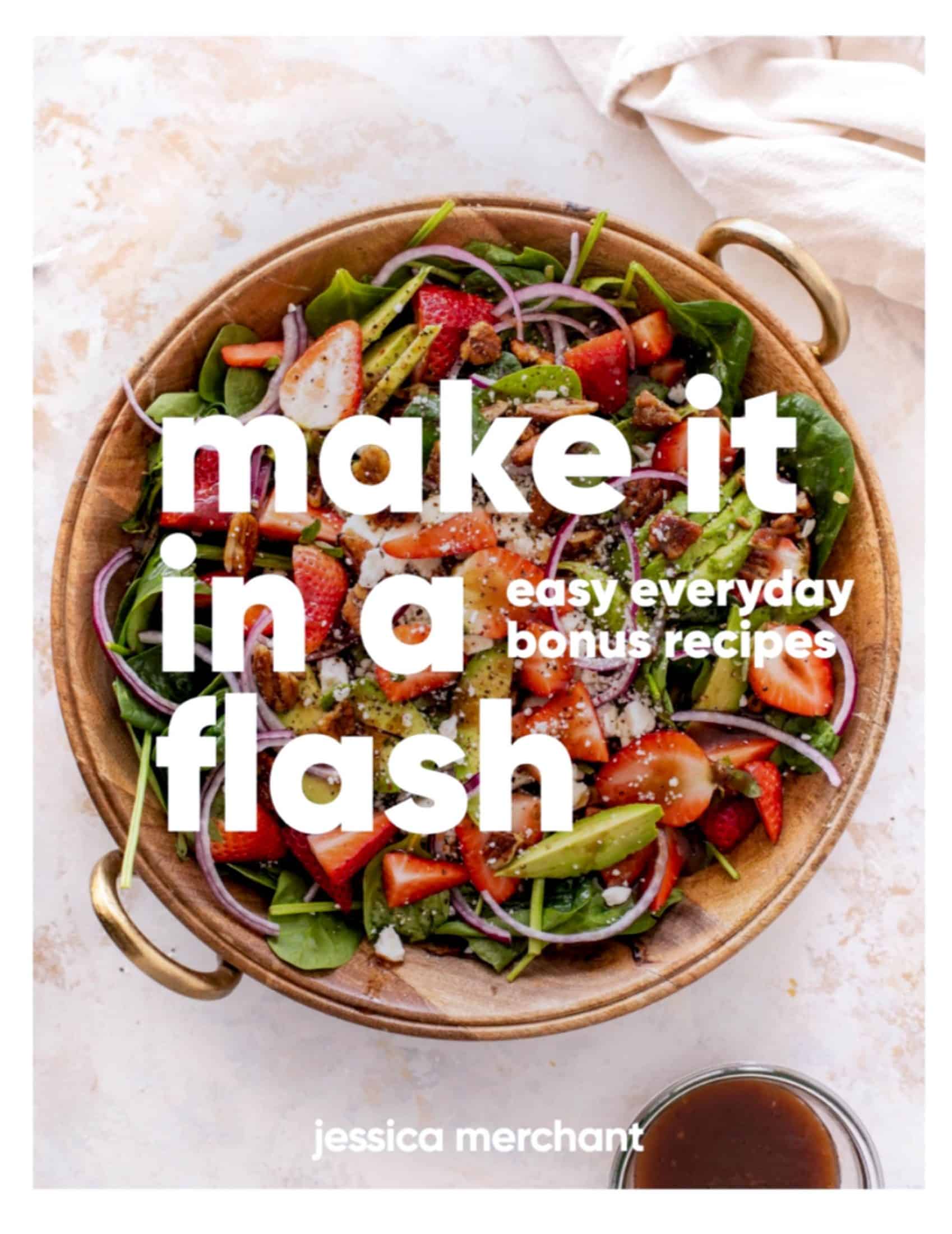 This bonus cookbook is called MAKE IT IN A FLASH! It includes 15 brand new recipes that take 20 minutes each. Yes! 15 new 20-minute recipes that are SO DELISH. Think pan crisp tacos, caprese farro salad, creamy cacio e pepe gnocchi, honey garlic smoked sausage and more. SO many more.
