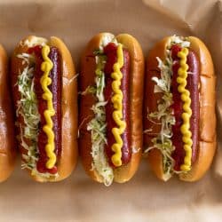 Okay, so this isnβt actually about the hot dog. But I always love one really good hot dog in the summer. It just TASTES like summer, you know? Toasty brioche bun, maybe a mix of ketchup and mustard and even a drizzle of relish.