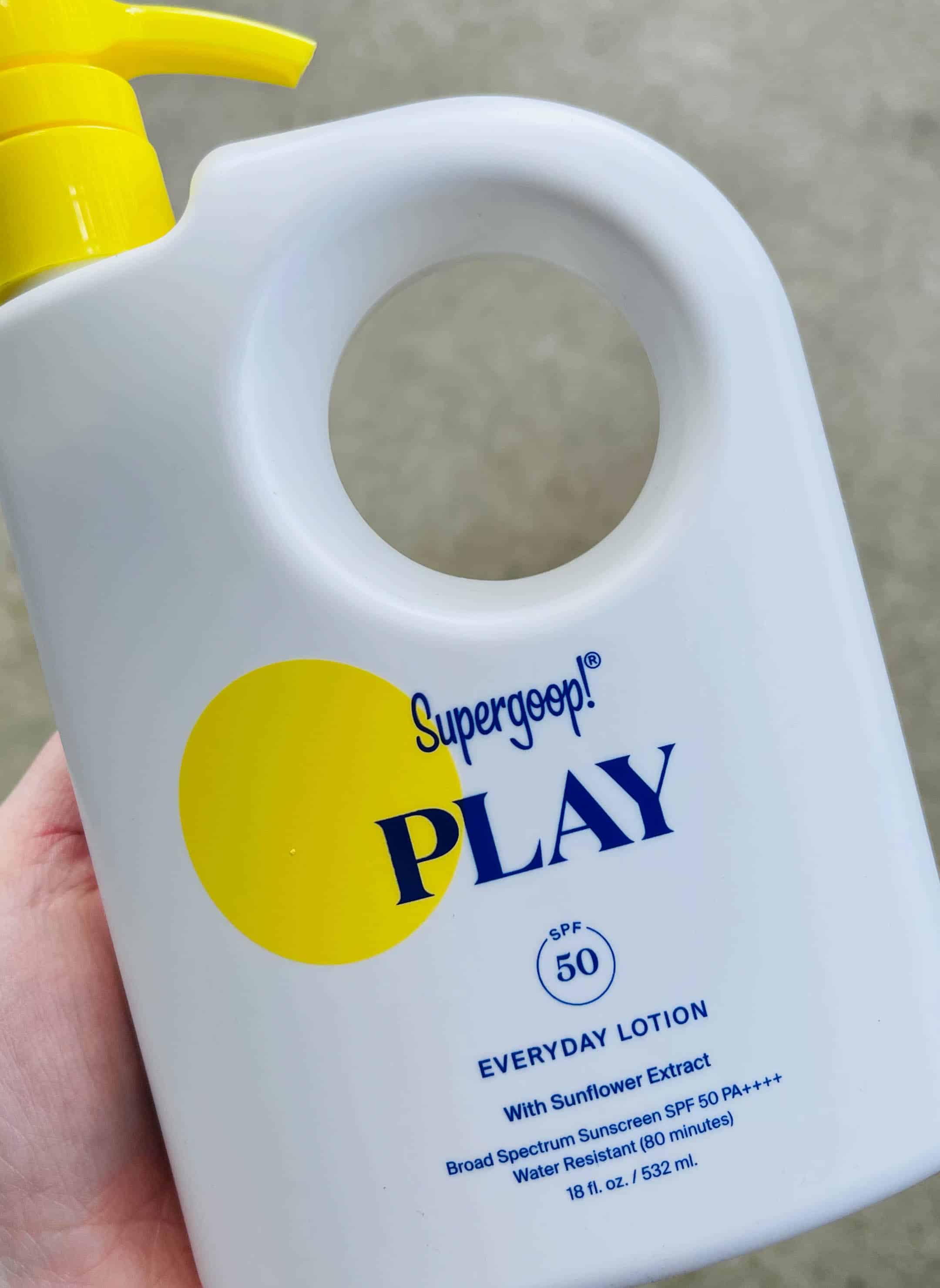 I buy this supergoop play everyday jumbo pump sunscreen every year and we keep it in the garage. This is used by EVERYONE. It’s fabulous and right there on the shelf when you step out the door. We also will use this to fill the solar buddies in a pinch.