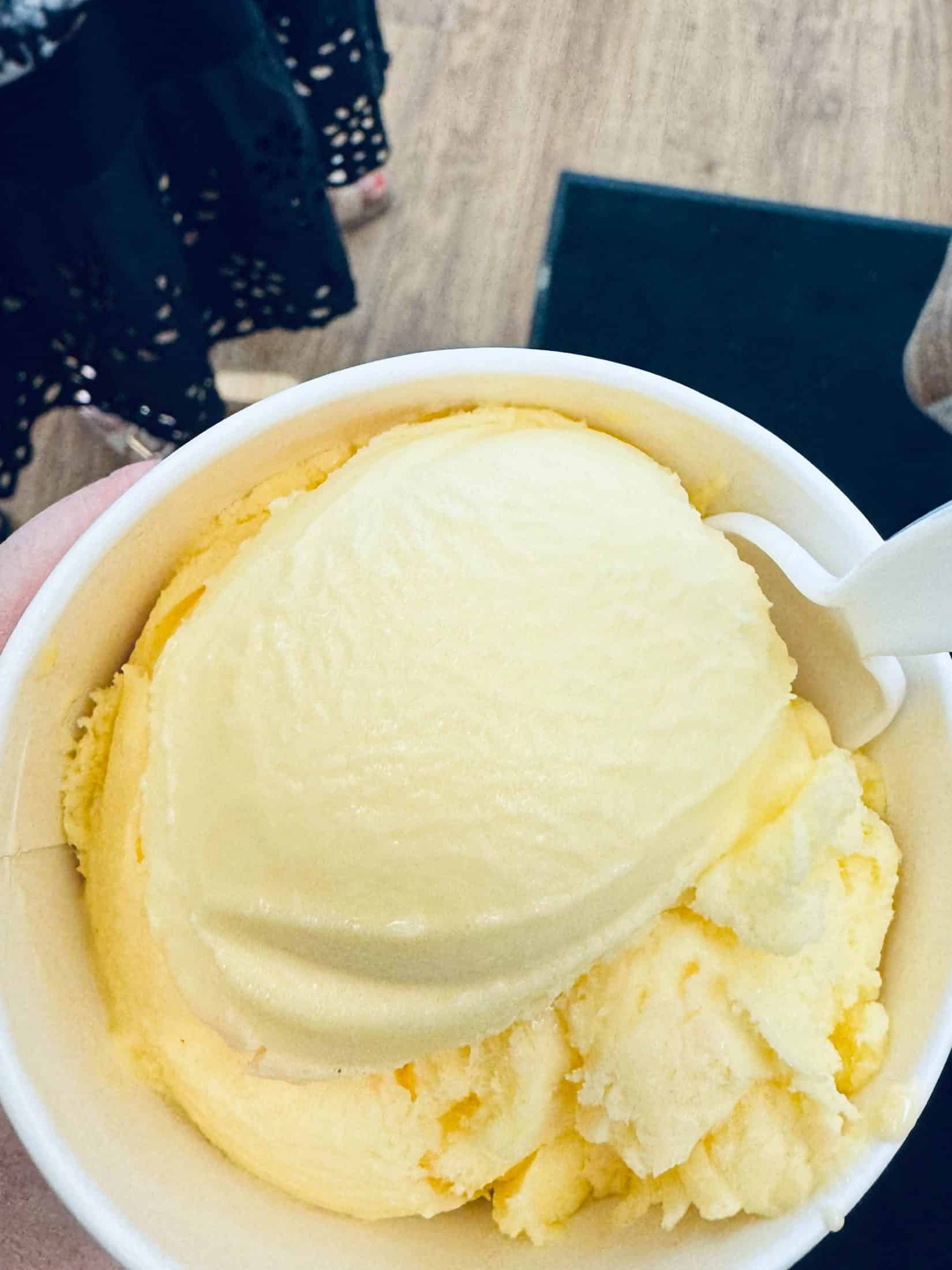 Third… ice cream! This is lemon sorbet. Tastes so good because it’s so hot.