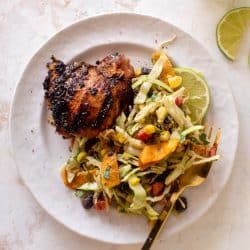 First up, the grilled taco chicken. These are chicken thighs that I use some taco-inspired seasoning on and then throw on the grill. Super easy and so flavorful.