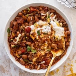 I also like to top baked potatoes, sweet potatoes and let’s be real – hot dogs – with chili. My love language is a chili bar. One of my favorite things to do for a party!