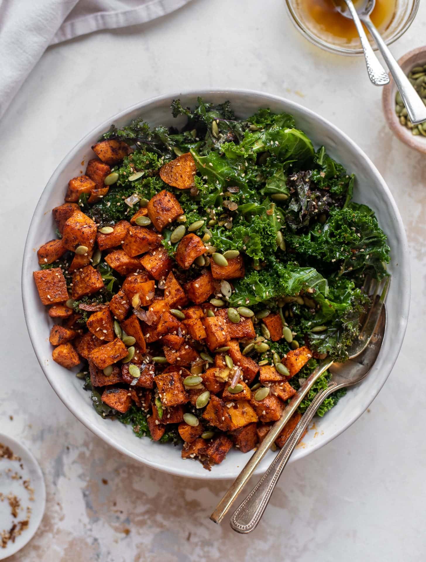 This smoky sweet potato kale salad is one that holds up so well for a few days in the fridge. Store the ingredients separately and the only thing you’d need to warm is the dressing.
