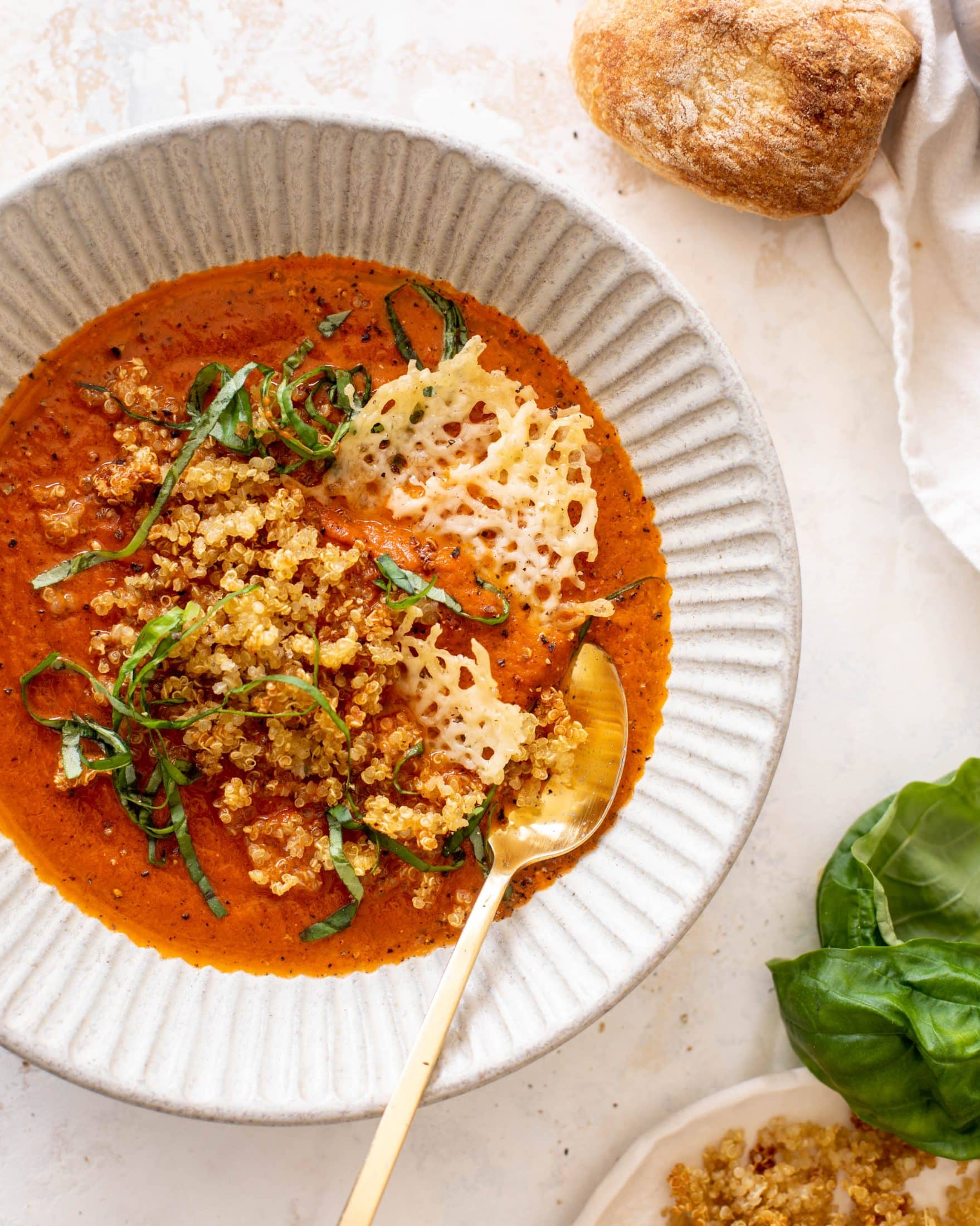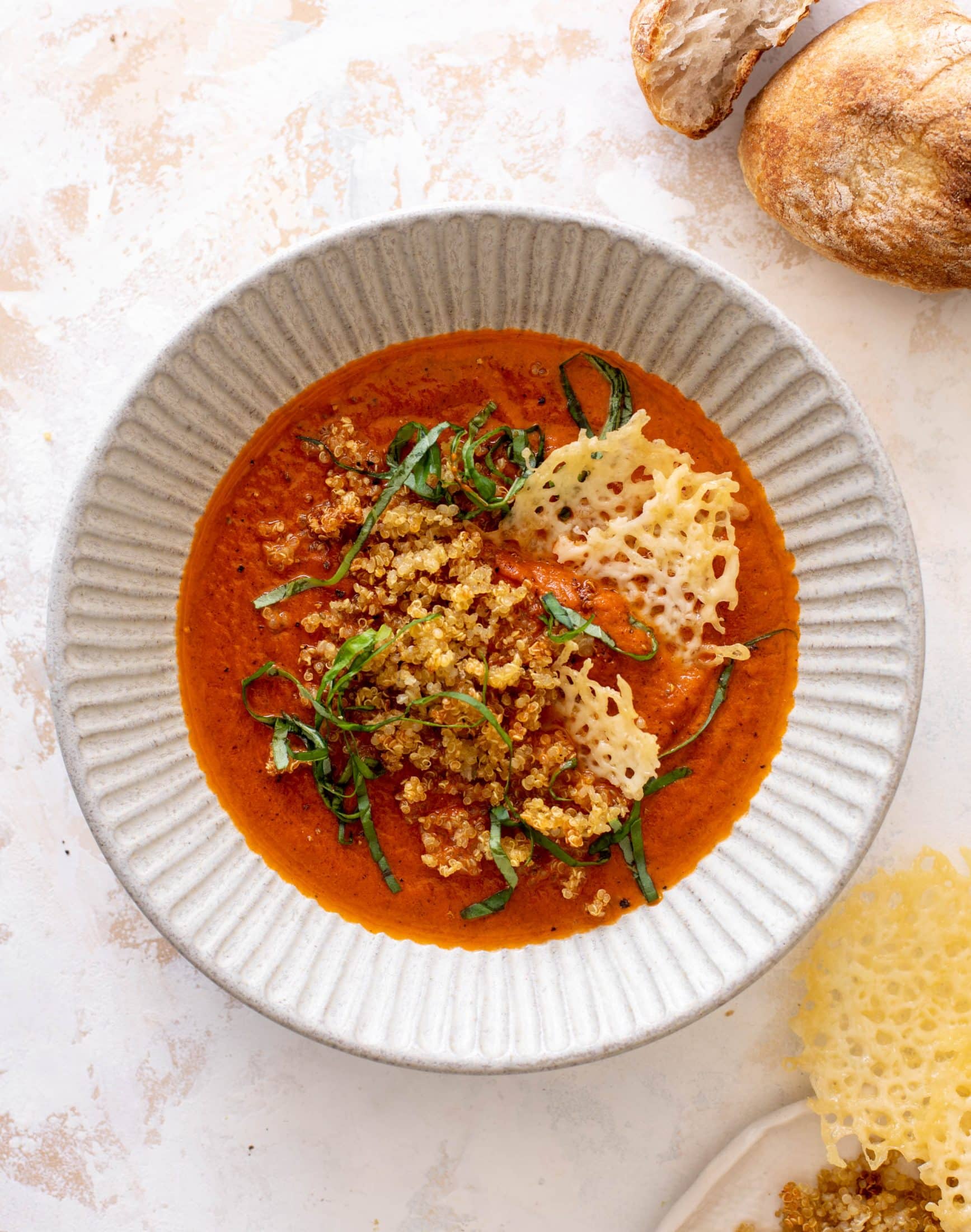 • Serve the soup in bowls with a scoop of toasty quinoa, a few cheese crisps and fresh basil. Enjoy!