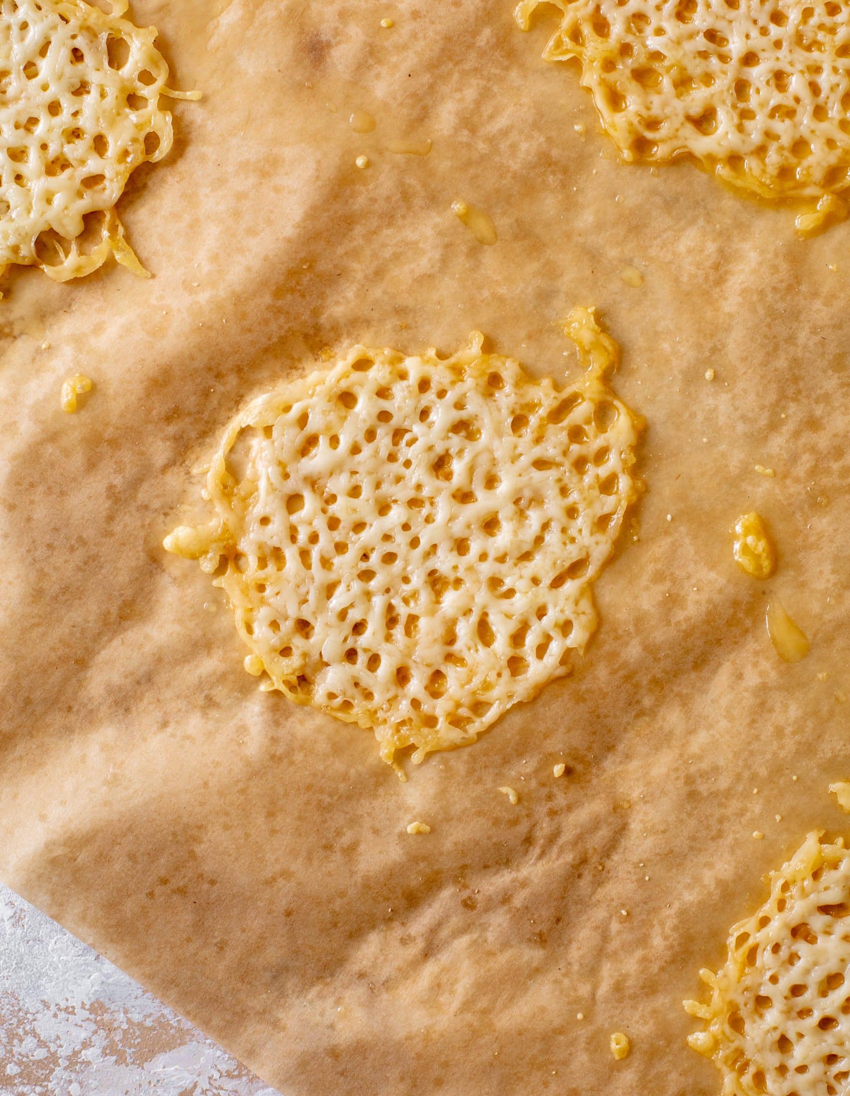 • Drop small piles (about 2 tablespoons worth) of asiago cheese on the parchment paper 2 inches apart. Stick the pan in the oven and bake for 4 to 5 minutes, or until the cheese is melty and crisp. Remove and let cool for 10 minutes before removing the crisps from the pan.