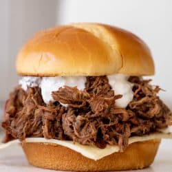 Now, I have a slow cooker that sears meat directly in the crock and I LOVE it. It’s super easy to use and a great option. If you don’t have that, I highly suggest searing the beef in a large pot or dutch oven before adding it to the slow cooker. This brings SO much flavor to the finished product. It keeps it juicy too.