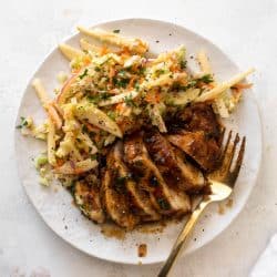 This sticky apple cider chicken is such a lovely fall meal! Chicken thighs are browned and served with a sticky cider sauce alongside a crunchy, refreshing autumn slaw. It’s the best combo and very light, satisfying and flavorful.