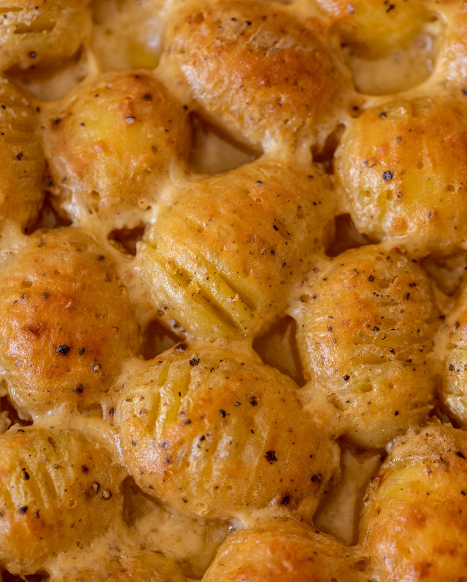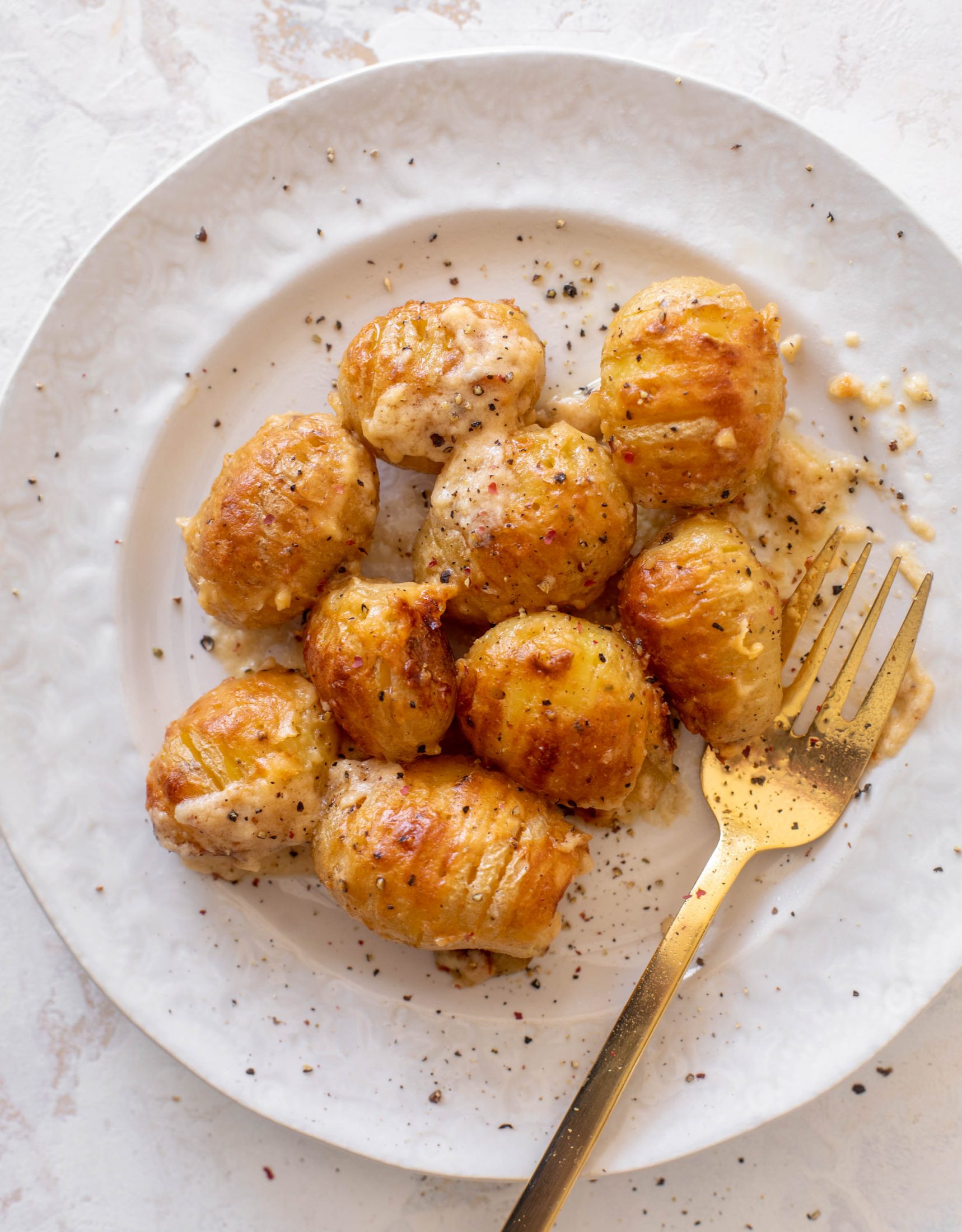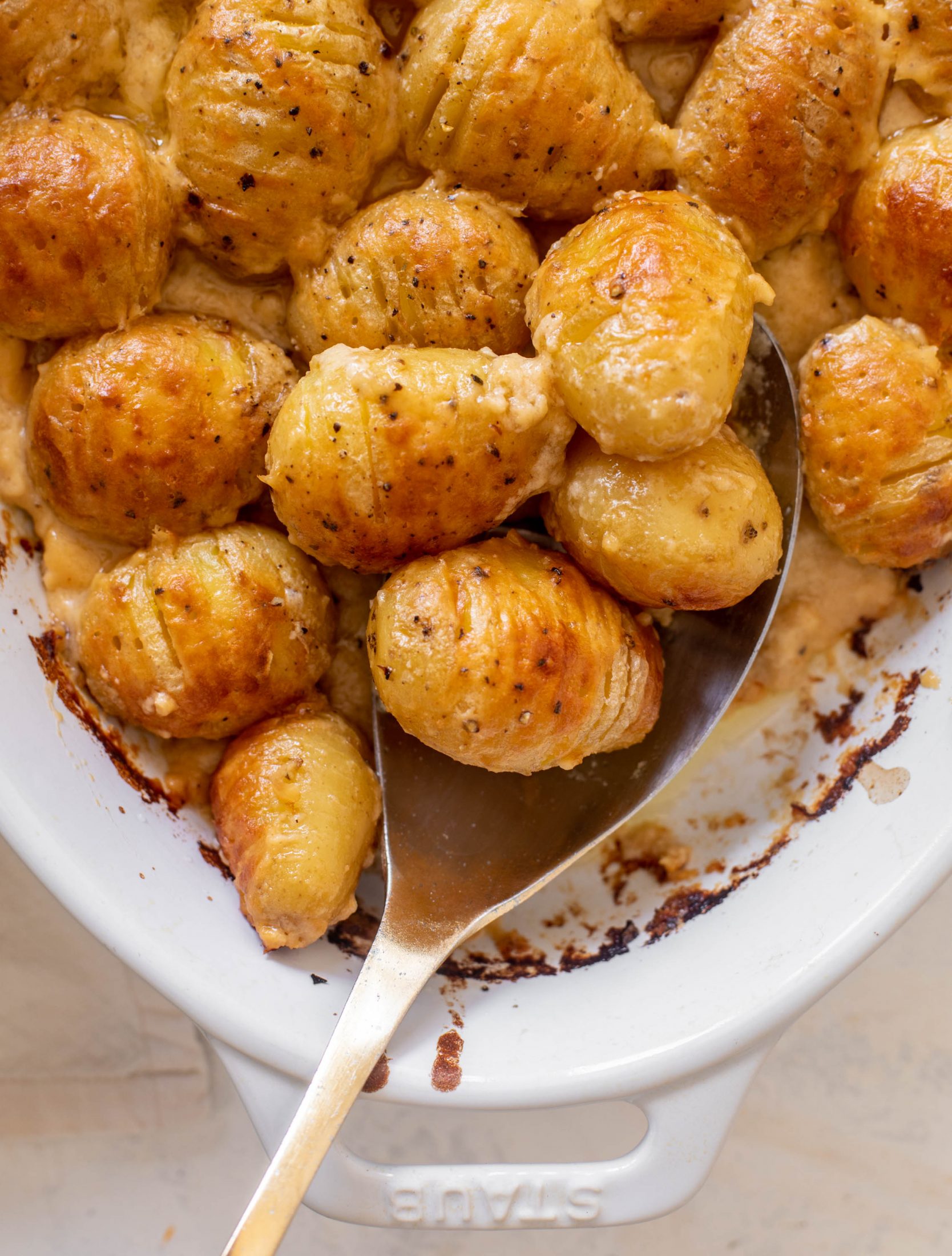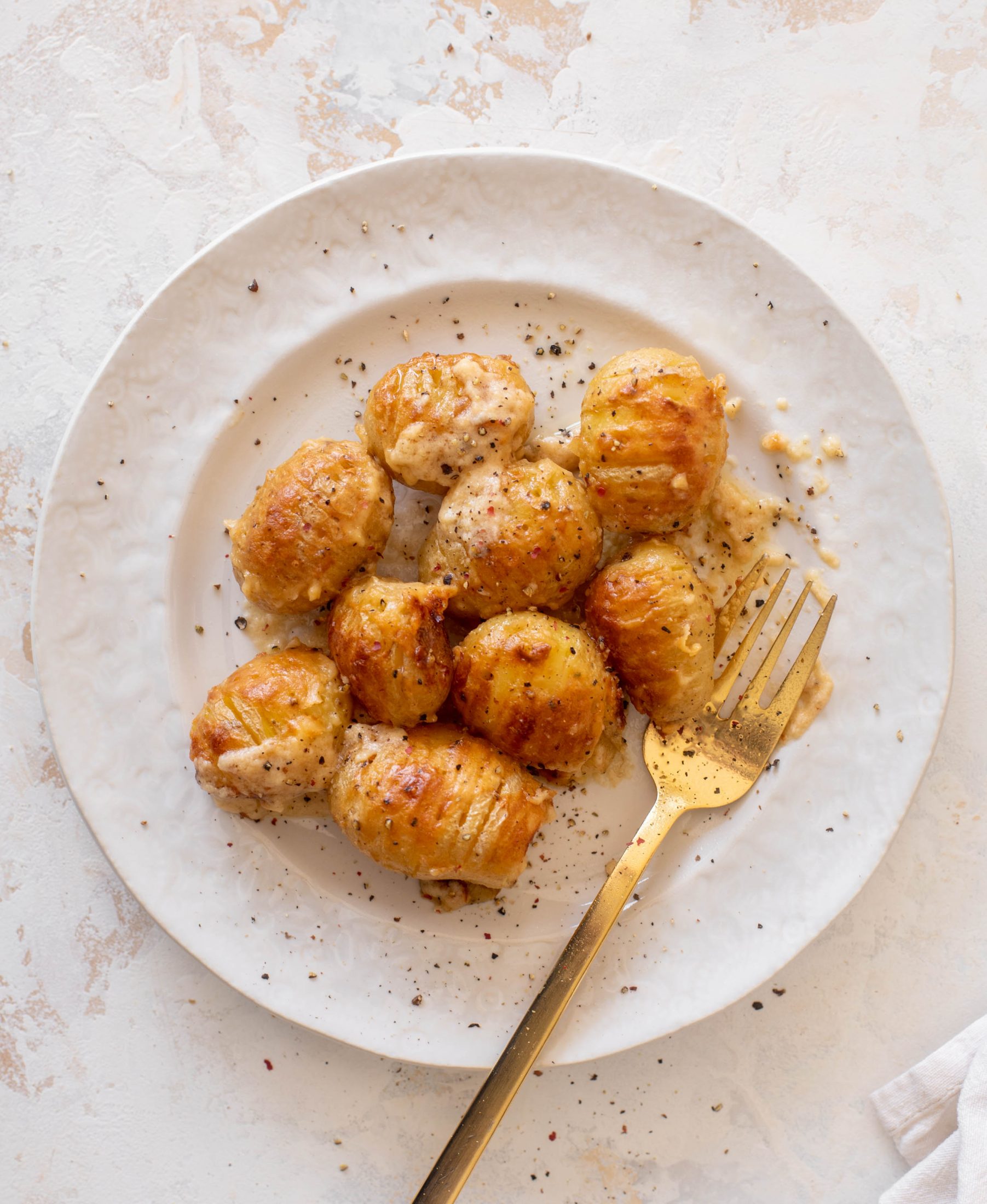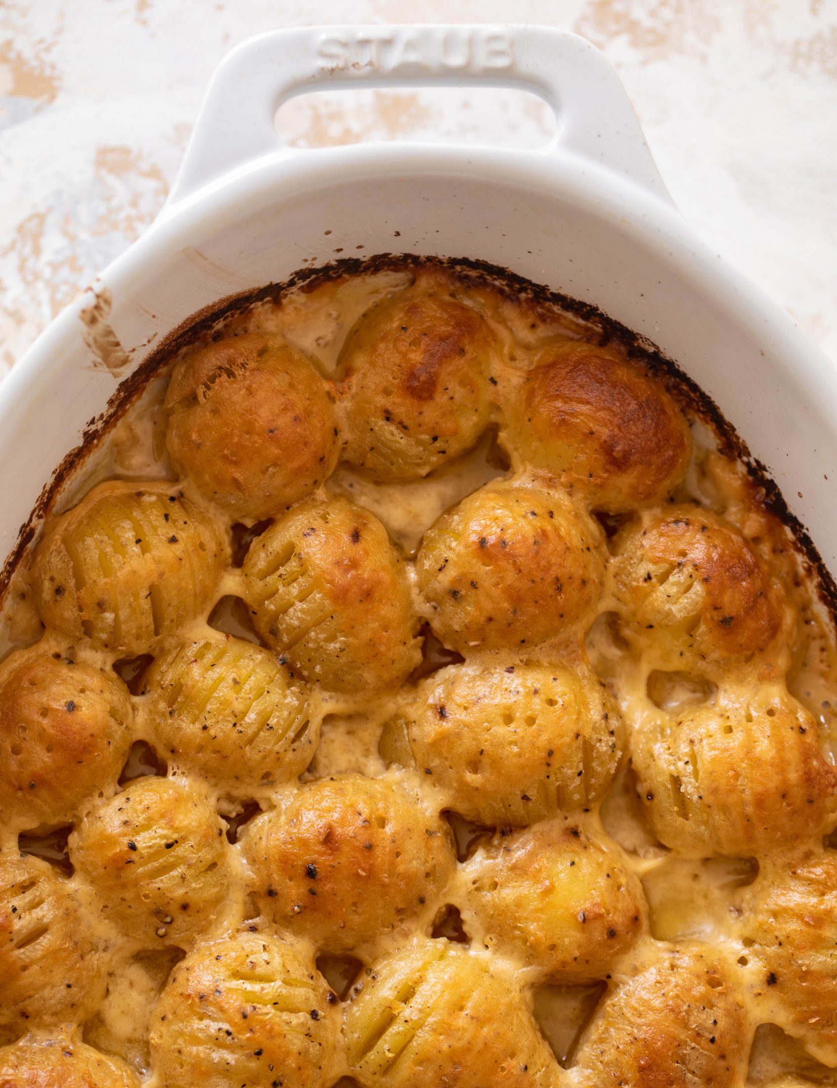 If you’re really feeling frisky, you can stuff something tiny into the mini hasselback potatoes. Like maybe a small slab of garlic butter or even a shred of cheese. But trust me, the quick bechamel is doing the work for us here.