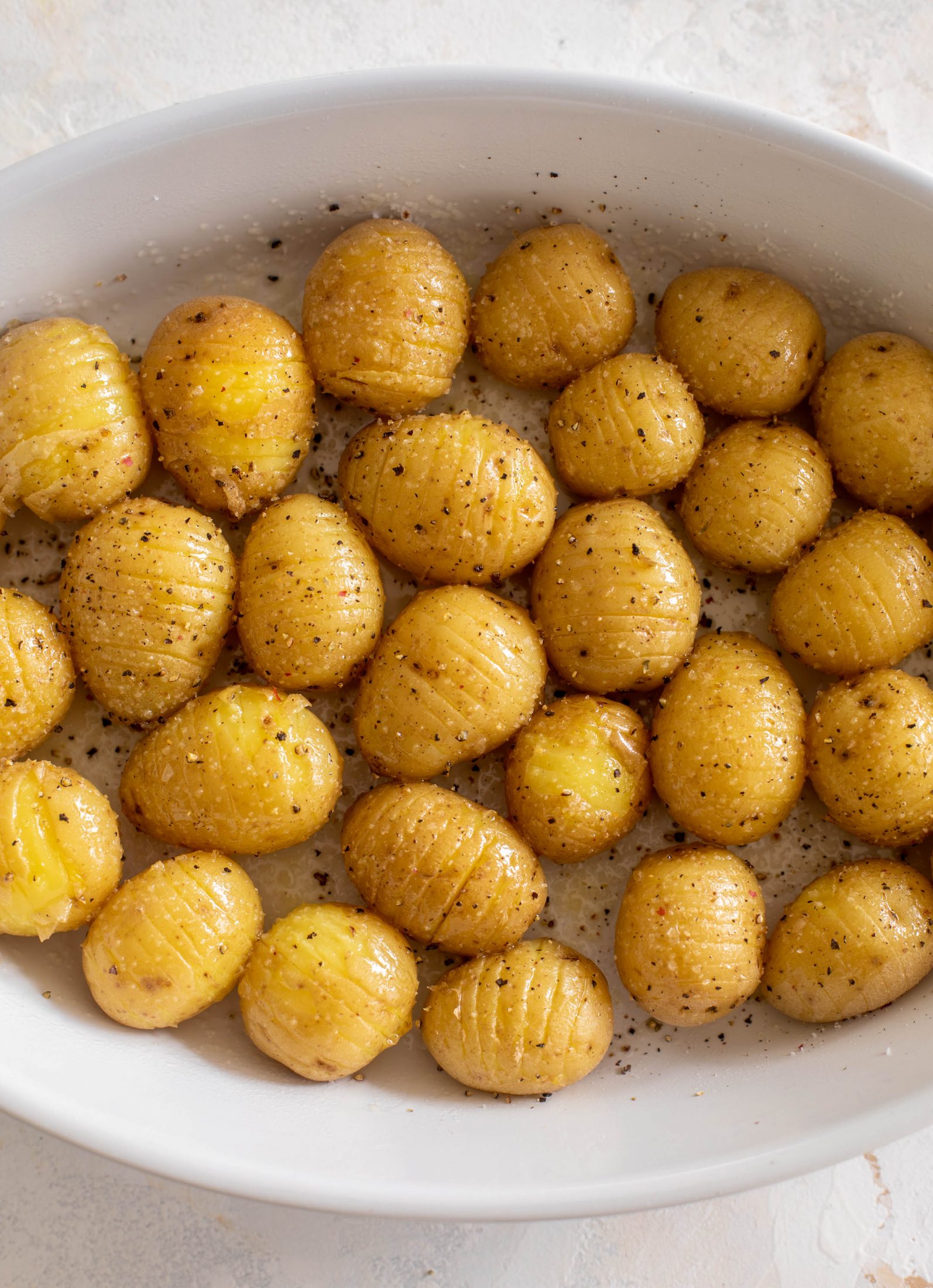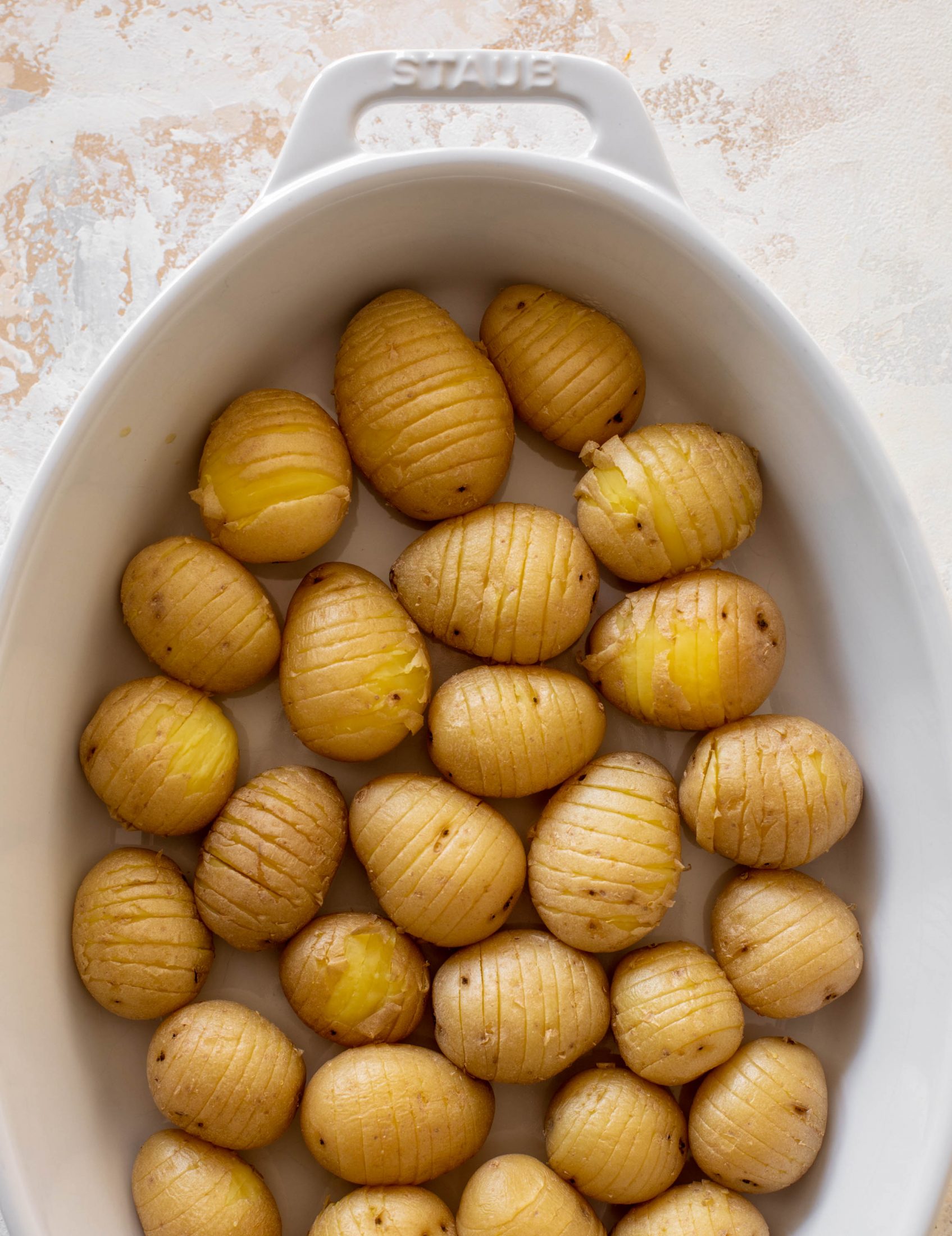 - Place one potato on a cutting board. Place 2 knives on either side - this allows you to slice the potato without cutting it the whole way through. Make small slices from the top of the potato down, not cutting through. Repeat with the remaining potatoes. Place all the potatoes in a baking dish in a single layer. Drizzle with the olive oil and sprinkle all over with salt and pepper.