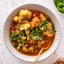 It’s also a fun change-up from traditional taco-inspired soups! We almost always use rotisserie chicken and maybe beef or ground turkey. So making it with shrimp is an expected but very welcome treat. And the whole frozen shrimp thing makes it SO easy too.
