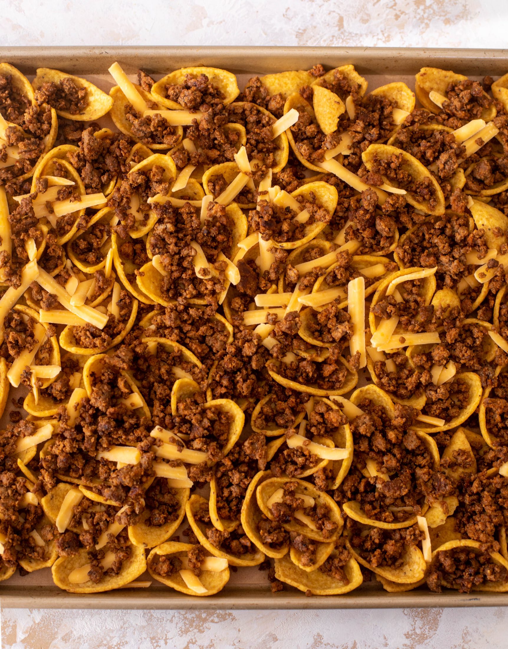 - Spread the fritos out on a sheet pan with the scoop facing up. Add a sprinkle of the cheese on top. Spoon the ground beef all over the chips so it sits inside each scoop.
