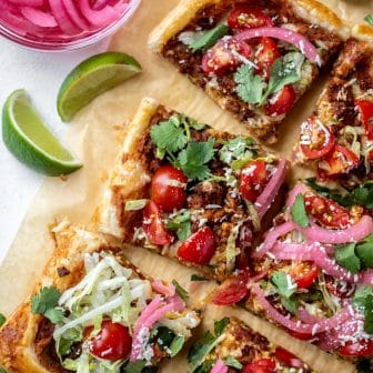 This taco puff pastry pizza is such a great weeknight meal! Flaky crust topped with taco meat, cheese, beans and all your favorite toppings....