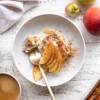 This apple cinnamon baked oatmeal is so satisfying and comforting! Make ahead and serve with honey, cream and cinnamon. Delicious and perfect for apple...