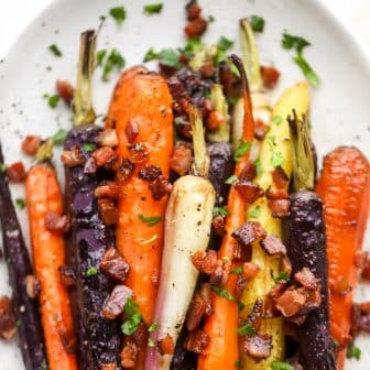 Nothing brings in spring like bacon roasted carrots. Aren’t you so excited too? A sweet + savory side dish is exactly what I need.