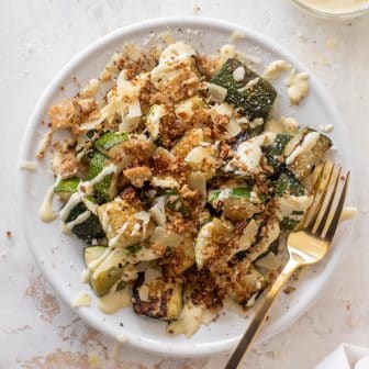 Oh how I love this grilled zucchini caesar! Big chunks of zucchini, charred and caramelized on the grill, drizzled with greek yogurt caesar dressing...