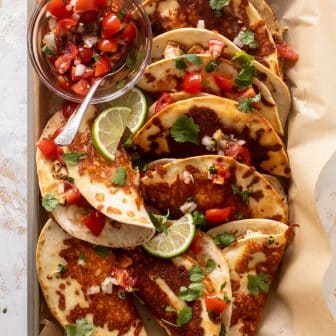 These crispy cheesy chicken tacos are dreamy! Made with seasoned chicken thighs, the tortillas are coated in melty, crispy cheese and topped with a...