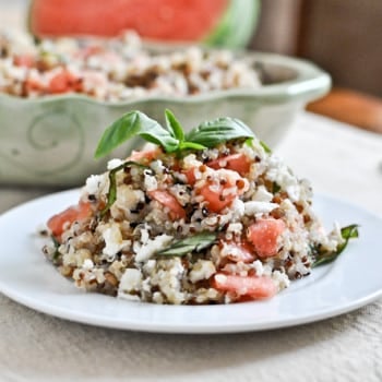 Watermelon Feta + Basil Quinoa serves 2-4 generously 1 cup uncooked quinoa, rinsed (I used a mix of TJ’s tricolor quinoa) 3/4 teaspoon salt...