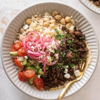 The best mediterranean beef bowls! These are a family favorite, made with jasmine rice and chickpeas, seasoned ground beef, tomatoes, cucumbers, hummus, feta and...