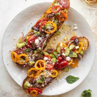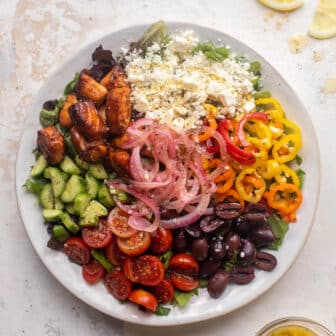 This salmon greek salad is one of my all-time favorite salads! Crispy lemon salmon, a greens salad packed with sweet peppers, olives, tomatoes, feta...