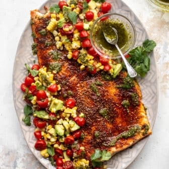 This summer salmon recipe is my favorite! Grilled blackened salmon served with herby chimichurri and a tomato corn salad. It’s delicious and satisfying! Summer...