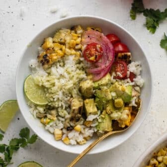 We love these grilled chicken rice bowls! The chicken is juicy and flavorful, marinaed in cilantro lime dressing. The bowl is filled with corn,...
