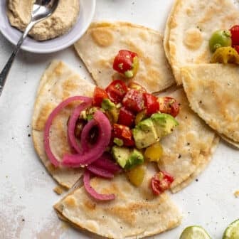 We love these hummus quesadillas! Crispy, golden tortilla shells filled with smooth and creamy hummus. Top with a quick avocado tomato salad and your...