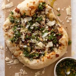 Summer Mushroom Grilled Pizza with Pistachio Vinaigrette.