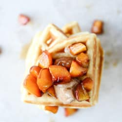 Vanilla Yeasted Waffles with Roasted Peach Maple Syrup.