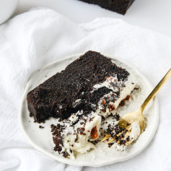 Whole Wheat Chocolate Fudge Zucchini Snack Cake with Candied Pistachios.