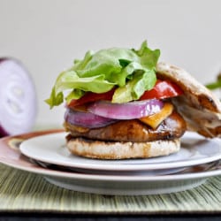 Piled Portobello Gouda Burgers with Roasted Garlic.