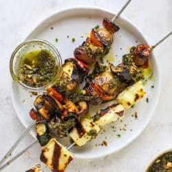 Grilled Vegetable and Halloumi Skewers with Pistachio Pesto.