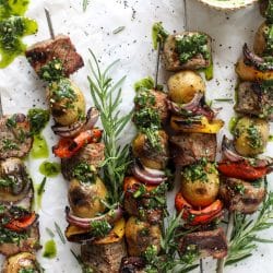 Grilled Filet and Potato Skewers with Rosemary Chimichurri.