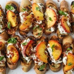 Basil Butter Crostini with Burrata, Grilled Peach and Pancetta.