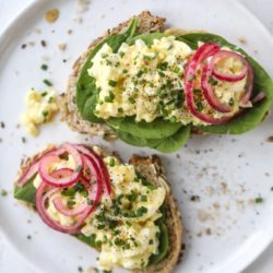 Goat Cheese Tartines with Hard Boiled Egg Vinaigrette.