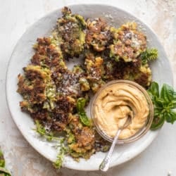 Brussels Sprouts Fritters with Tomato Basil Aioli.