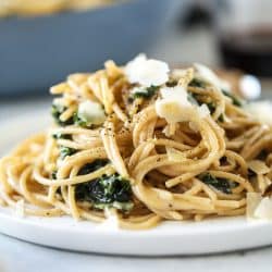 Caramelized Shallot, Spinach and Goat Cheese Garlic Butter Pasta.