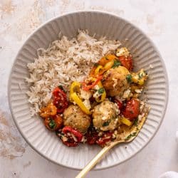 Sheet Pan Chicken Meatballs with Tomatoes and Feta.