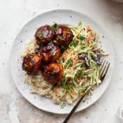 Sticky BBQ Chicken Meatballs with Broccoli Slaw.