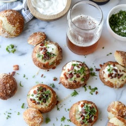 Cider Cheese Soup Shooters in Mini Pretzel Bread Bowls.